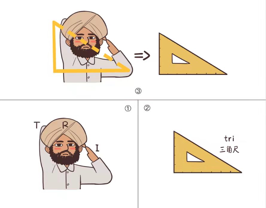 我们规定:tri=三角尺。从字母结构上讲,tri是triangle(城镇)的核心成分。