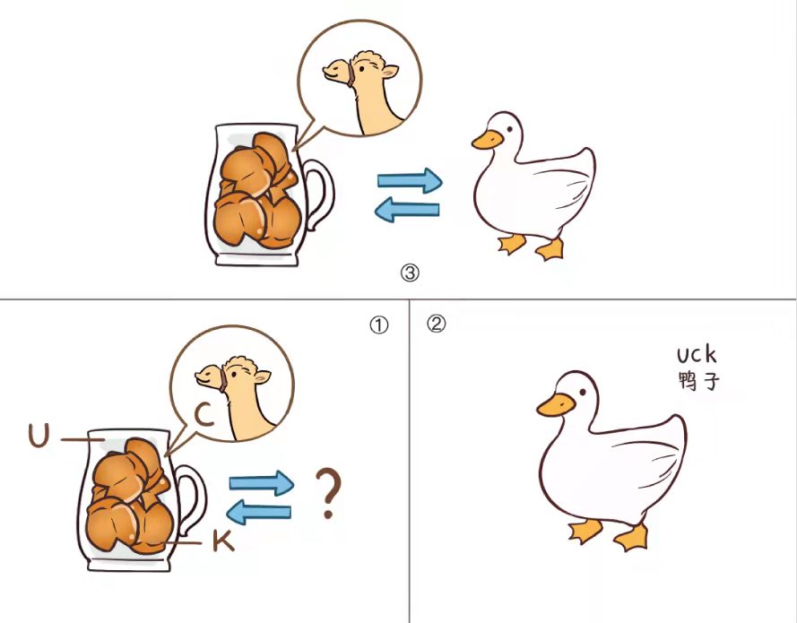 我们规定:uck=鸭子。从字母结构上讲,uck是duck(鸭子)的核心成分。